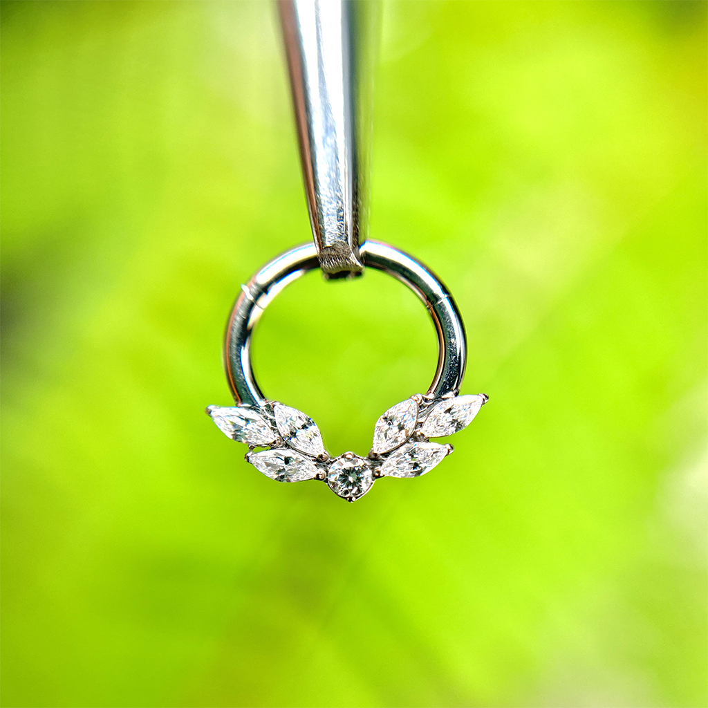 Hermoso aro con diseño de alas perfecto para las perforaciones como séptum o daith, todas nuestras joyas tienen garantía de dos meses por caída de circones.
