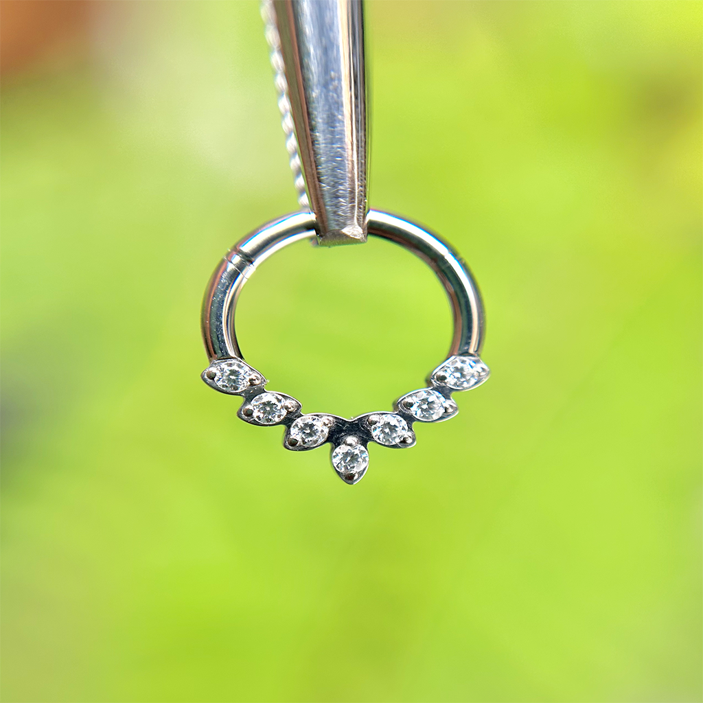 Hermoso aro con circones de excelente brillo, perfecto para perforaciones como séptum o daith.