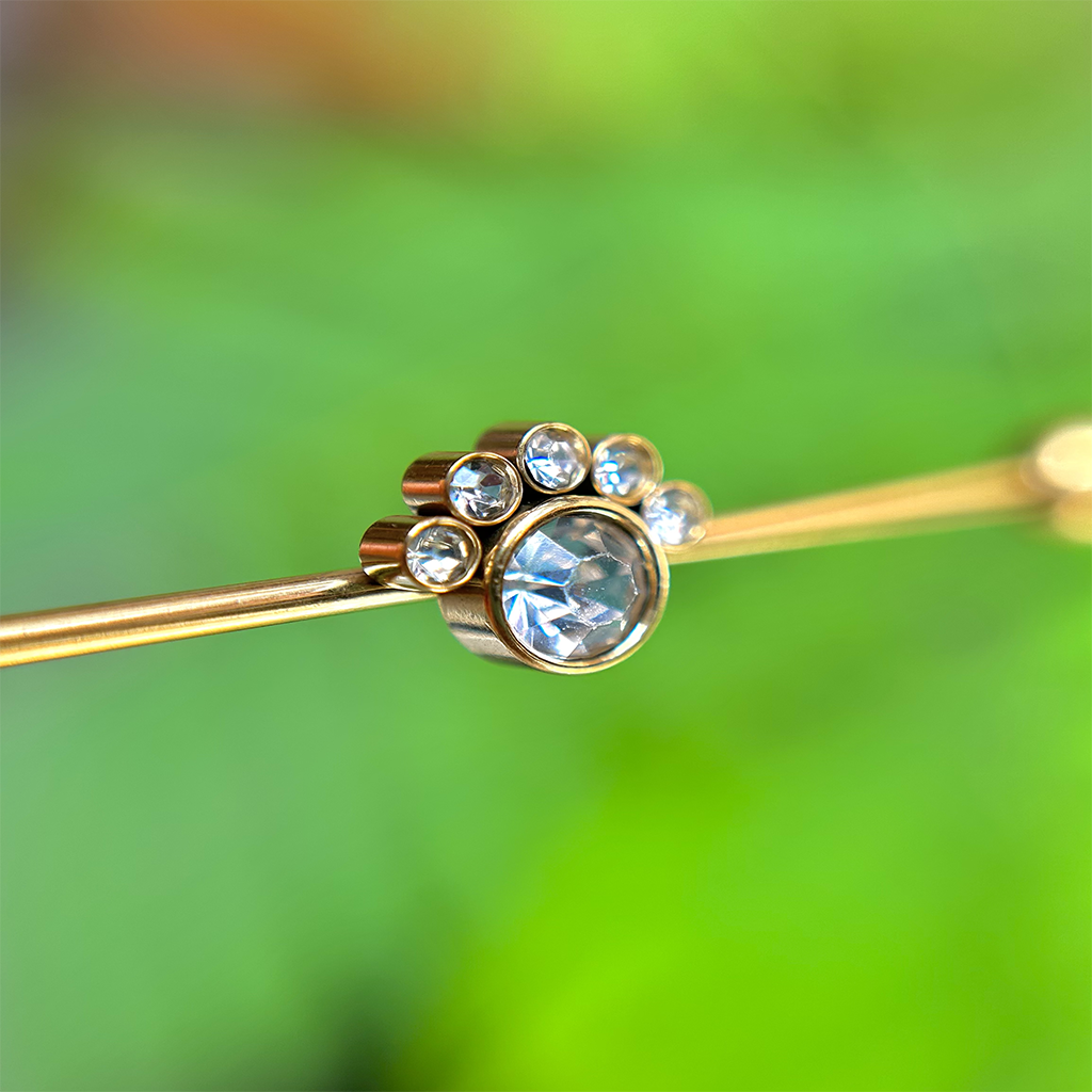 Hermosa joya de acero inoxidable con circones de excelente brillo y calidad, ideal para la perforación industrial, si estás en proceso de cicatrización o presentas alergias en tus perforaciones, no recomendamos este material. En las joyas doradas puede atenuarse el color con el uso.